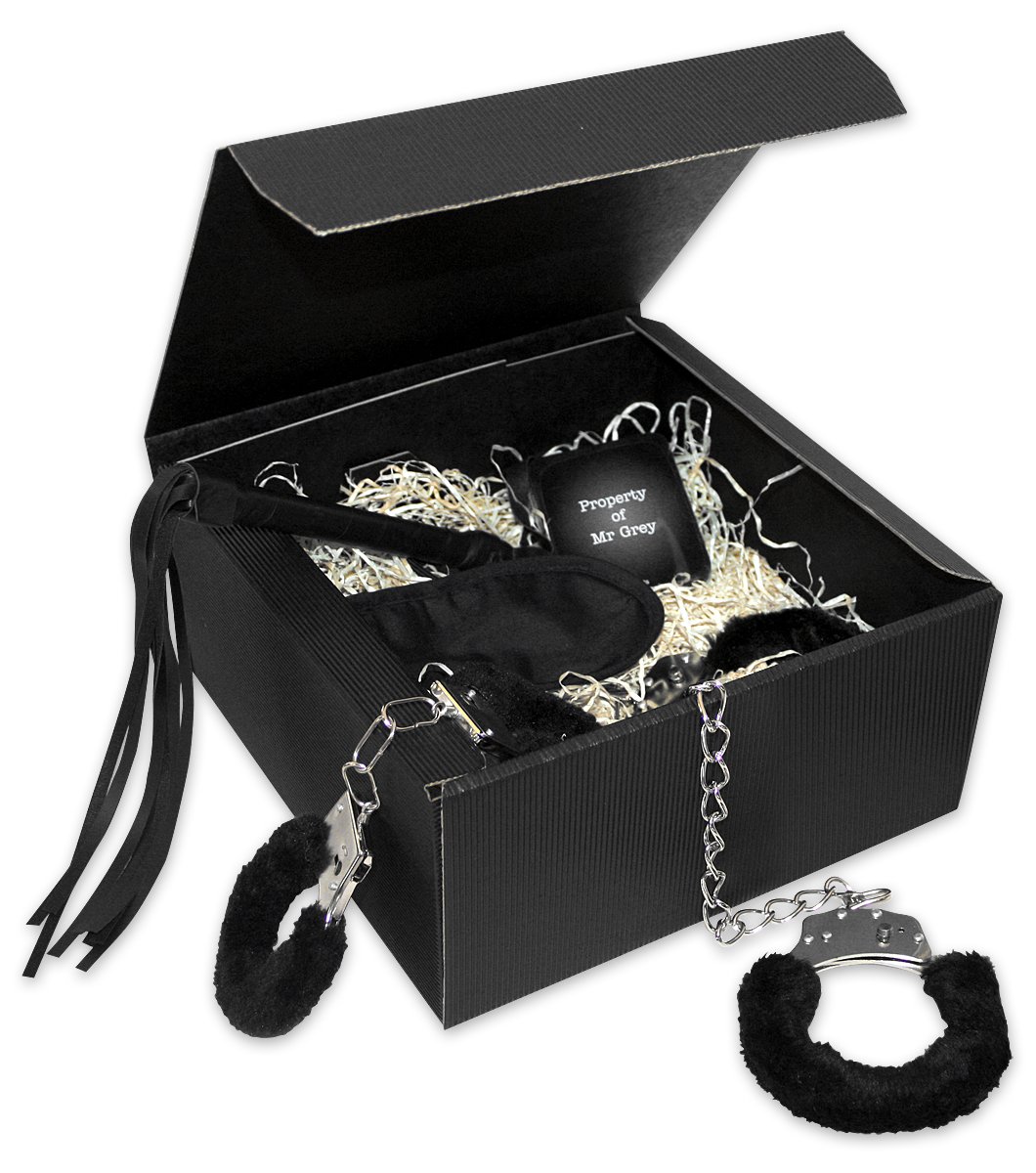 un coffret cadeau "Dominant - Soumise" avec une paire de menotte, un masque, un martinet.